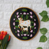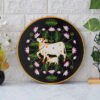 Awash in rich colors, this pichwai painting showcases a mother cow and her calf, surrounded by an abundance of blossoming flowers. This hand-painted artwork is a beautiful representation of nurturing love and the interconnectedness of life and nature.
